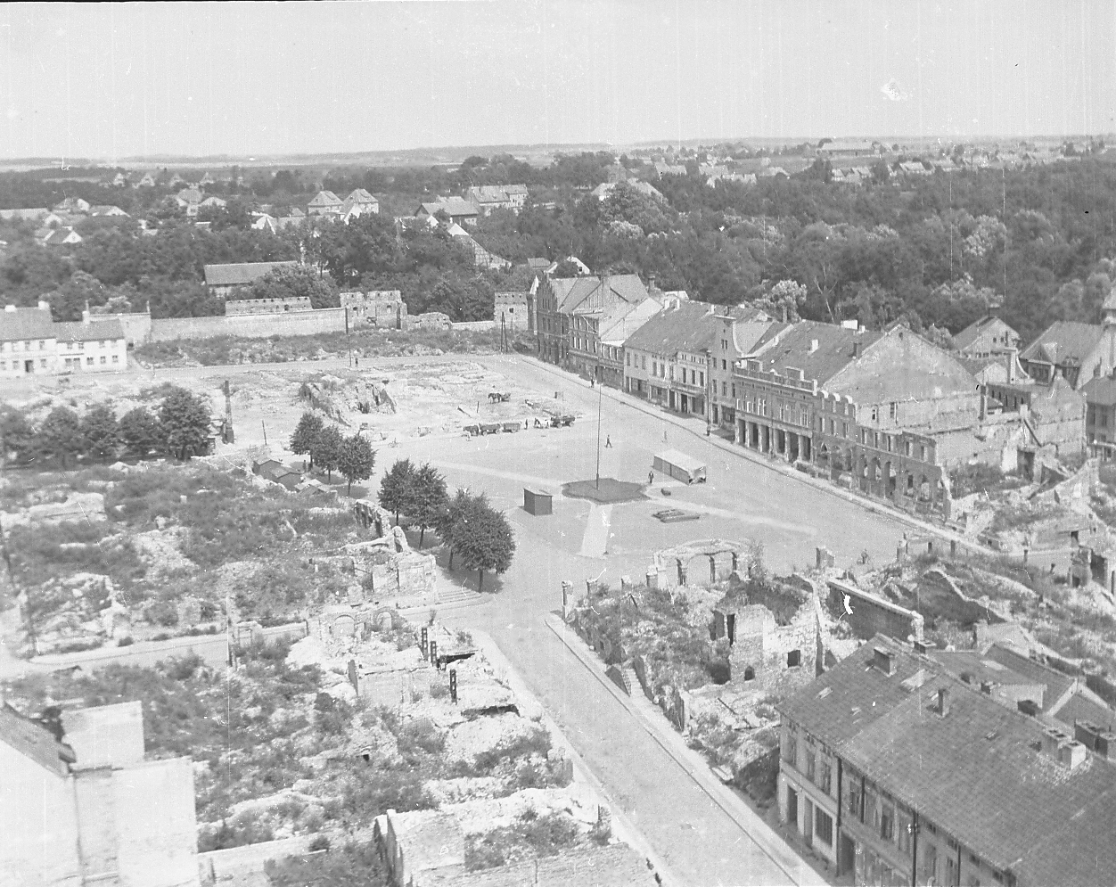 ludzie ; kamienice ; ruiny ; pawilony ; drzewa ; wozy ; konie(?) ; słupy energetyczne ; słupy oświetleniowe